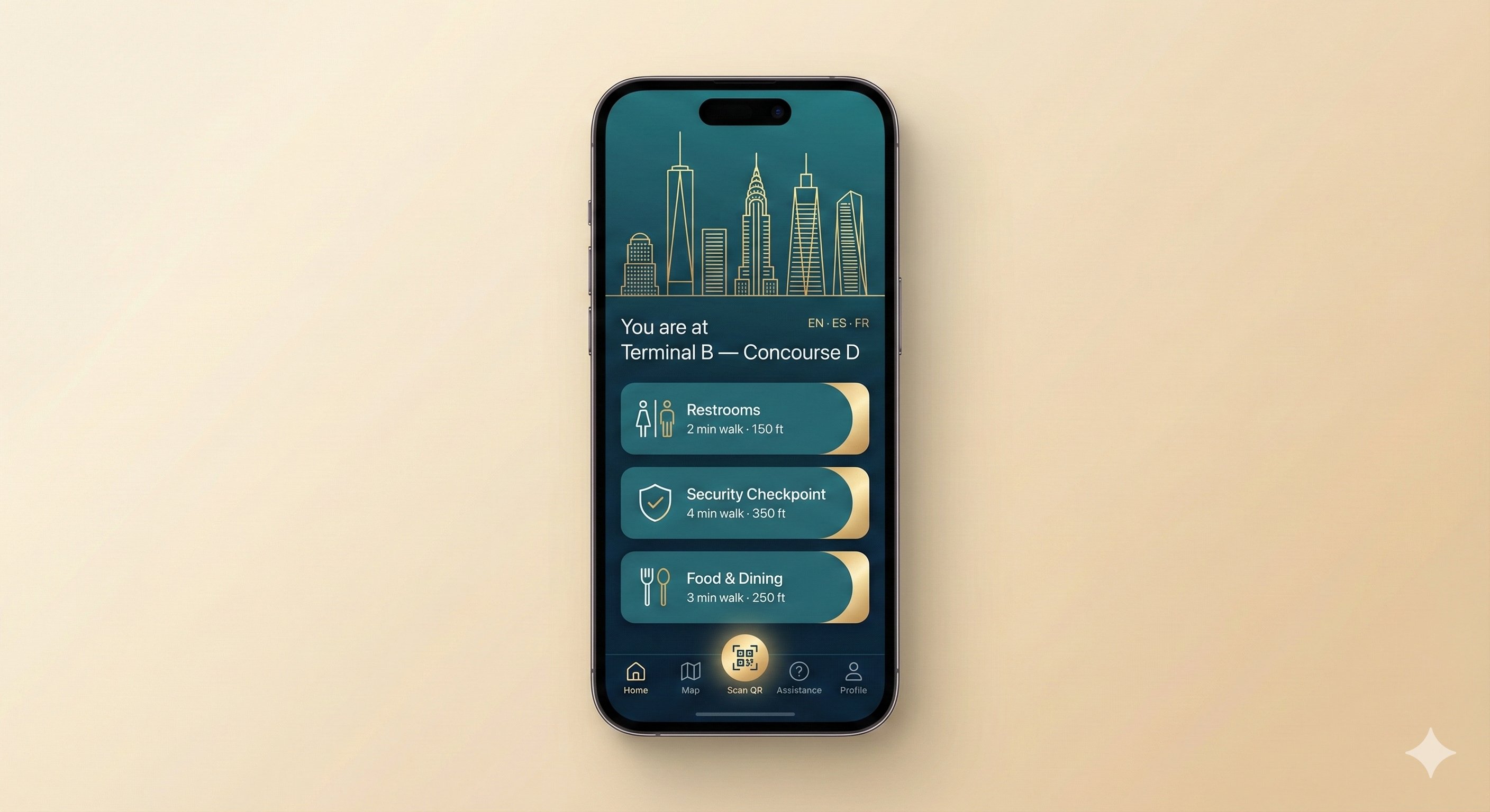 A simple QR-activated guidance layer available anywhere in the terminal. No apps, no hardware, no friction — just instant clarity, multilingual support, and calm directions that reduce staff load and improve passenger flow.
